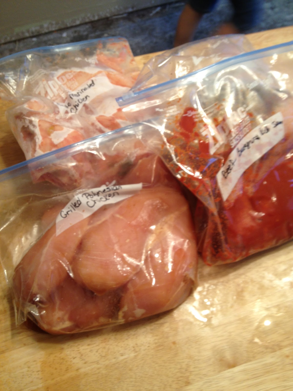 | A few of our freezer packs, made with chicken, roast, and steak. From these packs will come the two cups of shredded meat I’ll use in future casseroles, soups, stews, etc. |