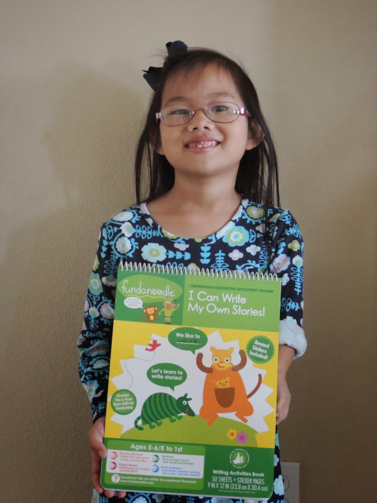 This is my daughter, Hannah. She’s about to turn 8, and was adopted from China at age 3 1/2. She has done amazingly well learning English, and is in second grade at school, but every once in a while we come across some learning gaps. She’s been working in the I Can Write My Own Stories book, from Fundanoodle’s green line.